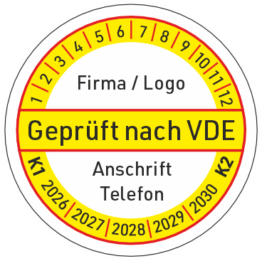 Prüfetikett Geprüft nach VDE mit Firmenaufdruck.
