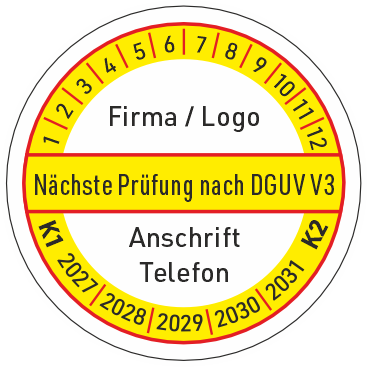 Prüfplakette Nächste Prüfung nach DGUV V3 mit Firmenaufdruck.