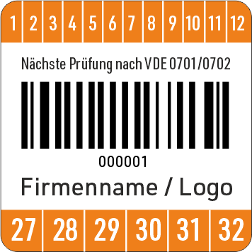 Barcodeprüfplakette Nächste Prüfung nach VDE 0701/07022 mit fortl. Barcode und Firmeneindruck.