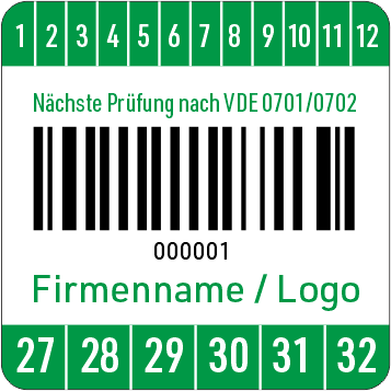 Barcodeprüfplaketten Nächste Prüfung nach VDE 0701/07022 mit fortl. Barcode und Firmeneindruck.