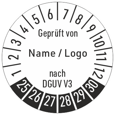 Prüfplaketten mit Logo - Geprüft von... nach DGUV V3 mit Firmenaufdruck. (DGUV Vorschrift 3 ersetzt die BGV A3)