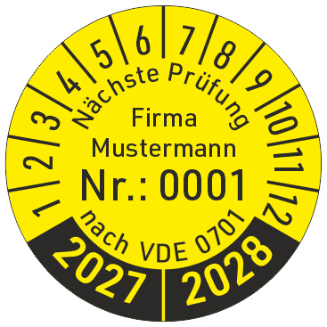 Prüfplaketten Nächste Prüfung nach VDE 0701 mit Werbeaufdruck und fortlaufender Numerierung.